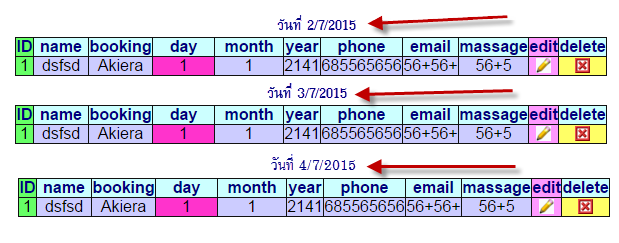 <head> <meta http-equiv="Content-Type" content="text/html; charset=tis-620"> <title>:: show data ::</title> <style> BODY { FONT-FAMILY: Arial, Helvetica, sans-serif } </style> <script Language="Javascript"> <!-- function Conf(object) { if (confirm("you need to delete?") == true) { return true; } return false; } //--> </script> </head> <body> <p align="center"> <font size="3"><< <a href="index.php">home</a> >> </font> <p align="center"><u><b><font size="5" color="#800000">booking list </font></b></u></p> </p> <center> <?php ob_start(); ?> <table border="1" cellpadding="0" cellspacing="0" style="border-collapse: collapse" bordercolor="#111111" width="95%" id="AutoNumber1"> <tr> <td width="5%" bgcolor="#66FF66" align="center"> <b><font color="#000080">ID</font></b></td> <td width="20%" bgcolor="#CCFFFF" align="center"> <p align="center"><b><font color="#000080">name</font></b></p></td> <td width="10%" bgcolor="#CCFFFF" align="center"><b> <font color="#000080">booking</font></b></td> <td width="40%" bgcolor="#CCFFFF" align="center"><b> <font color="#000080">day</font></b></td> <td width="40%" bgcolor="#CCFFFF" align="center"><b> <font color="#000080">month</font></b></td> <td width="40%" bgcolor="#CCFFFF" align="center"><b> <font color="#000080">year</font></b></td> <td width="40%" bgcolor="#CCFFFF" align="center"><b> <font color="#000080">phone</font></b></td> <td width="40%" bgcolor="#CCFFFF" align="center"><b> <font color="#000080">email</font></b></td> <td width="40%" bgcolor="#CCFFFF" align="center"><b> <font color="#000080">massage</font></b></td> <td width="5%" bgcolor="#FF99FF" align="center"><b> <font color="#000080">edit</font></b></td> <td width="5%" bgcolor="#CCFFFF" align="center"><b> <font color="#000080">delete</font></b></td> </tr> <?php $tb_head = ob_get_clean(); ?> <?php include("config.inc.php"); // คำสั่ง SQL ที่ใช้ในการเลือกข้อมูลที่อยู่ในฐานข้อมูลกลับมา (เรียงตามลำดับ ID) $result = mysql_query("select * from member order by id"); $date = null; /* ในลูปด้านล่าง เทียบได้กับการดึงข้อมูลมาทีละ 1 Record เพื่อนำมาแสดงผลทางหน้าจอ */ while ($dbarr = mysql_fetch_array($result)) { $currentDate = $dbarr['day'].'/'.$dbarr['month'].'/'.$dbarr['year']; if ($date != $currentDate){ if (is_null($date)===false){ echo '</table>'; } $date = $currentDate; echo "วันที่ $date $tb_head"; } ?> <tr> <td width="5%" bgcolor="#66FF66" align="center"><?php echo $dbarr['id']; ?></td> <td width="10%" bgcolor="#CCCCFF" align="center"><?php echo $dbarr['name']; ?></td> <td width="6%" bgcolor="#CCCCFF" align="center"><?php echo $dbarr['booking']; ?></td> <td width="10%" bgcolor="#FF33CC" align="center"><?php echo $dbarr['day']; ?></td> <td width="10%" bgcolor="#CCCCFF" align="center"><?php echo $dbarr['month']; ?></td> <td width="10%" bgcolor="#CCCCFF" align="center"><?php echo $dbarr['year']; ?></td> <td width="10%" bgcolor="#CCCCFF" align="center"><?php echo $dbarr['phone']; ?></td> <td width="10%" bgcolor="#CCCCFF" align="center"><?php echo $dbarr['email']; ?></td> <td width="15%" bgcolor="#CCCCFF" align="center"><?php echo $dbarr['text']; ?></td> <td width="5%" bgcolor="#FF99FF" align="center"><center><a href="editdata.php?id=<?= $dbarr['id']; ?>"><img src="edit.gif" width="15" height="15" border="0"></a></center></td> <td width="5%" bgcolor="#FFFF66" align="center"><center><a href="deletedata.php?id=<?= $dbarr['id']; ?>" OnClick="return Conf(this)"><img src="delete.jpg" width="15" height="15" border="0"></a></center></td> </tr> <?php } ?> </table> </center> </body>