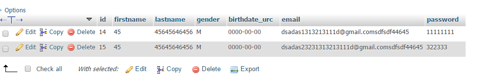 $query = "INSERT INTO user_rent(firstname,lastname,gender,birthdate_urc,email,password) VALUES('$fname','$lname','$gd','$bd','$email','$upass')";
