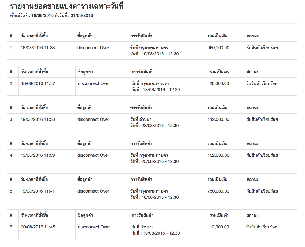 <div class="page-header"> <h3>รายงานยอดขายแบ่งตารางเฉพาะวันที่</h3> <h5>ตั้งแต่วันที่ : <?php echo thaidate($_GET['stdate']); ?> ถึงวันที่ : <?php echo thaidate($_GET['endate']); ?></h5> </div> <?php $where = ' where orders_date>="'.$_GET['stdate'].'" and orders_date<="'.$_GET['endate'].'" '; $query = sprintf('select * from orders %s order by orders_date asc',$where); $result = mysqli_query($con,$query); if (mysqli_num_rows($result)>0) { $sum=0; for ($i=1;$i<=mysqli_num_rows($result);$i++) { $rs = mysqli_fetch_array($result); ?> <table class="table table-bordered"> <thead> <tr> <th>#</th> <th>วัน-เวลาที่สั่งซื้อ</th> <th>ชื่อลูกค้า</th> <th>การรับสินค้า</th> <th>รวมเป็นเงิน</th> <th>สถานะ</th> </tr> </thead> <?php $query2 = 'select * from orders_detail where orders_id='.$rs['orders_id']; $result2 = mysqli_query($con,$query2); for ($j=1;$j<=mysqli_num_rows($result2);$j++) { $rs2 = mysqli_fetch_array($result2); $query3 = 'select * from product where pro_no="'.$rs2['pro_no'].'"'; $result3 = mysqli_query($con,$query3); $rs3 = mysqli_fetch_array($result3); $sum=$rs2['pro_amount'] * $rs3['pro_price']; } $query3 = sprintf('select * from branch where br_id=%s',$rs['branch_id']); $result3 = mysqli_query($con,$query3); $rs3 = mysqli_fetch_array($result3);?> <tbody> <tr> <td><?php echo $i; ?></td> <td><?php echo thaidate($rs['orders_date']).' '.$rs['orders_time']; ?></td> <td><?php echo $rs['cus_name']; ?></td> <td><?php echo 'รับที่ '.$rs3['br_name'].'<br> วันที่ : '.thaidate($rs['rec_date']).' - '.$rs['rec_time']; ?></td> <td><?php echo number_format($sum,2); ?></td> <td> <?php if ($rs['orders_status']==1) {echo 'ยังไม่ชำระเงิน';} else if ($rs['orders_status']==2) { echo 'รอการตรวจสอบ'; } else if ($rs['orders_status']==3) { echo 'รอจัดส่งสินค้า'; } else {echo 'รับสินค้าเรียบร้อย';} ?> </td> </tr> <?php }} ?> </tbody> </table>