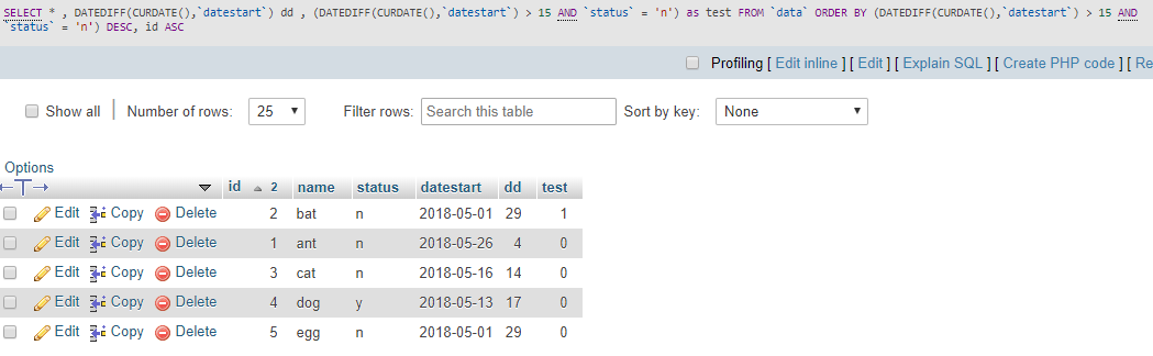, (DATEDIFF(CURDATE(),`datestart`) > 15 AND `status` = 'n') as test