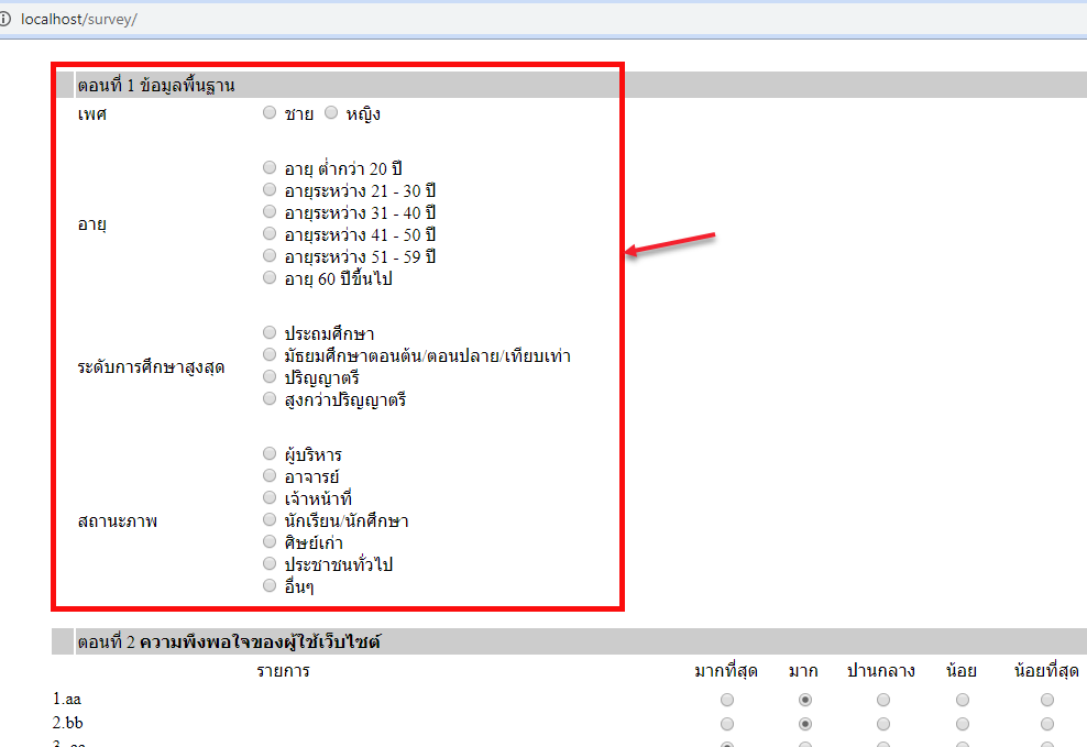 <!DOCTYPE HTML PUBLIC "-//W3C//DTD HTML 4.01 Transitional//EN" "http://www.w3.org/TR/html4/loose.dtd"> <html> <head> <title>แบบสำรวจออนไลน์</title> <meta http-equiv="Content-Type" content="text/html; charset=utf-8"> </head> <body> <script language="JavaScript"> function fncSubmit() { if(document.frmMain.rdo_gender_0.checked == false && document.frmMain.rdo_gender_1.checked == false) { alert('กรุณาระบุ เพศ'); return false; } if(document.frmMain.rdo_age_0.checked == false && document.frmMain.rdo_age_1.checked == false && document.frmMain.rdo_age_2.checked == false && document.frmMain.rdo_age_3.checked == false && document.frmMain.rdo_age_4.checked == false && document.frmMain.rdo_age_5.checked == false) { alert('กรุณาระบุ อายุ'); return false; } if(document.frmMain.rdo_education_0.checked == false && document.frmMain.rdo_education_1.checked == false && document.frmMain.rdo_education_2.checked == false && document.frmMain.rdo_education_3.checked == false ) { alert('กรุณาระบุ ระดับการศึกษาสูงสุด'); return false; } if(document.frmMain.rdo_state_0.checked == false && document.frmMain.rdo_state_1.checked == false && document.frmMain.rdo_state_2.checked == false && document.frmMain.rdo_state_3.checked == false && document.frmMain.rdo_state_4.checked == false && document.frmMain.rdo_state_5.checked == false && document.frmMain.rdo_state_6.checked == false) { alert('กรุณาระบุ สถานะภาพ'); return false; } var Rows = document.frmMain.hdnRows.value; for(x=1;x<=Rows;x++) { var op1 = document.getElementById("radionNo"+x+"_1"); var op2 = document.getElementById("radionNo"+x+"_2"); var op3 = document.getElementById("radionNo"+x+"_3"); var op4 = document.getElementById("radionNo"+x+"_4"); var op5 = document.getElementById("radionNo"+x+"_5"); if(op1.checked == false && op2.checked == false && op3.checked == false && op4.checked == false && op5.checked == false) { alert('Please select Answer No ' + x); return false; } } } </script> <form name="frmMain" method="post" action="save.php" OnSubmit="return fncSubmit();"> <table width="950" border="0" align="center" cellpadding="2" cellspacing="2"> <tr> <td colspan="8" align="center">แบบสำรวจออนไลน์</td> </tr> <tr> <td> </td> <td colspan="7"> </td> </tr> <tr bgcolor="#CCCCCC"> <td> </td> <td colspan="7">ตอนที่ 1 ข้อมูลพื้นฐาน</td> </tr> <tr> <td> </td> <td width="157">เพศ</td> <td width="387"> <label> <input type="radio" name="rdo_gender" value="ชาย" id="rdo_gender_0" /> ชาย</label> <label> <input type="radio" name="rdo_gender" value="หญิง" id="rdo_gender_1" /> หญิง</label> </td> <td width="68"> </td> <td width="60"> </td> <td width="69"> </td> <td width="65"> </td> <td width="78"> </td> </tr> <tr> <td> </td> <td> </td> <td> </td> <td> </td> <td> </td> <td> </td> <td> </td> <td> </td> </tr> <tr> <td> </td> <td>อายุ</td> <td> <label> <input type="radio" name="rdo_age" value="อายุ ต่ำกว่า 20 ปี" id="rdo_age_0" /> อายุ ต่ำกว่า 20 ปี</label> <br /> <label> <input type="radio" name="rdo_age" value="อายุระหว่าง 21 - 30 ปี" id="rdo_age_1" /> อายุระหว่าง 21 - 30 ปี</label> <br /> <label> <input type="radio" name="rdo_age" value="อายุระหว่าง 31 - 40 ปี" id="rdo_age_2" /> อายุระหว่าง 31 - 40 ปี</label> <br /> <label> <input type="radio" name="rdo_age" value="อายุระหว่าง 41 - 50 ปี" id="rdo_age_3" /> อายุระหว่าง 41 - 50 ปี</label> <br /> <label> <input type="radio" name="rdo_age" value="อายุระหว่าง 51 - 59 ปี" id="rdo_age_4" /> อายุระหว่าง 51 - 59 ปี</label> <br /> <label> <input type="radio" name="rdo_age" value="อายุ 60 ปีขึ้นไป" id="rdo_age_5" /> อายุ 60 ปีขึ้นไป</label> </td> <td> </td> <td> </td> <td> </td> <td> </td> <td> </td> </tr> <tr> <td> </td> <td> </td> <td> </td> <td> </td> <td> </td> <td> </td> <td> </td> <td> </td> </tr> <tr> <td> </td> <td>ระดับการศึกษาสูงสุด</td> <td> <label> <input type="radio" name="rdo_education" value="ประถมศึกษา" id="rdo_education_0"> ประถมศึกษา</label> <br> <label> <input type="radio" name="rdo_education" value="มัธยมศึกษาตอนต้น/ตอนปลาย/เทียบเท่า" id="rdo_education_1"> มัธยมศึกษาตอนต้น/ตอนปลาย/เทียบเท่า</label> <br> <label> <input type="radio" name="rdo_education" value="ปริญญาตรี" id="rdo_education_2"> ปริญญาตรี</label> <br> <label> <input type="radio" name="rdo_education" value="สูงกว่าปริญญาตรี" id="rdo_education_3"> สูงกว่าปริญญาตรี</label> <br> </td> <td> </td> <td> </td> <td> </td> <td> </td> <td> </td> </tr> <tr> <td> </td> <td> </td> <td> </td> <td> </td> <td> </td> <td> </td> <td> </td> <td> </td> </tr> <tr> <td> </td> <td>สถานะภาพ</td> <td> <label> <input type="radio" name="rdo_state" value="ผู้บริหาร" id="rdo_state_0" /> ผู้บริหาร</label> <br /> <label> <input type="radio" name="rdo_state" value="อาจารย์" id="rdo_state_1" /> อาจารย์</label> <br /> <label> <input type="radio" name="rdo_state" value="เจ้าหน้าที่" id="rdo_state_2" /> เจ้าหน้าที่</label> <br /> <label> <input type="radio" name="rdo_state" value="นักเรียน/นักศึกษา" id="rdo_state_3" /> นักเรียน/นักศึกษา