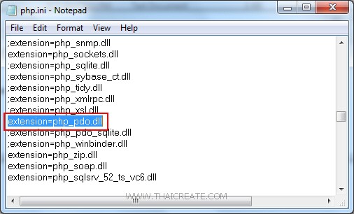 ให้ Copy ไฟล์ php_pdo.dll ไปไว้ในโฟเดอร์ของ extension เปิดไฟล์ php.ini แล้วเปิด extension