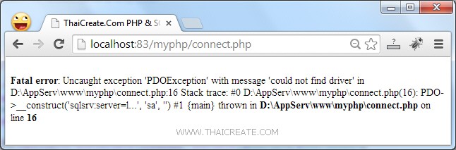 Fatal error: Uncaught exception 'PDOException' with message 'could not find driver' in D:\AppServ\www\myphp\connect.php:16 Stack trace: #0 D:\AppServ\www\myphp\connect.php(16): PDO->__construct('sqlsrv:server=l...', 'sa', '') #1 {main} thrown in D:\AppServ\www\myphp\connect.php on line 16
