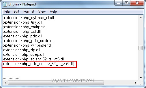 ให้ Copy ไฟล์ php_pdo_sqlsrv.dll ไปไว้ในโฟเดอร์ของ extension เปิดไฟล์ php.ini แล้วเปิด extension