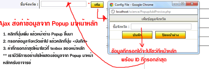 HOME > Client Script Forum > อาจารย์ครับสอบถามเรื่อง Ajax เพิ่มข้อมูลจาก Popup มาหลักแสดงที่หน้าหลักหน่อยครับ รูปภาพประกอบนะครับ