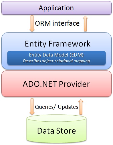 คือ Library ที่ทำหน้าที่จัดการ Database ร่วมกับการเขียน Class บนโปรแกรมที่เราจะเขียนขึ้น แนวคิดของ Entity Framework อยู่ในรูปแบบของ Object/Relational Mapping (O/RM) คือ Entity Framework จะสร้าง Layer ทำหน้าที่เป็น Database Model ขึ้นมาเป็น Class ใน Project ที่เรากำลังเขียน โดยจะ Mapping ตัว Class ที่จะสร้างขึ้นใหม่นี้ กับ Table , View และ Stored Procedure จาก Database มาไว้บนโปรเจค ซึ่งต่อไปนี้เราสามารถเรียกใช้มันผ่าน Class ที่อยู่ในโปรเจคได้เลย โดยไม่ต้องไปเขียนคำสั่ง SQL Statement ของ INSERT , UPDATE หรือ DELETE แล้วค่อยส่งไป Execute ที่ Table อีก เรียกได้ว่าต่อไปนี้ คำสั่ง SQL บนโปรเจคแทบจะไม่ต้องเขียนอีกเลย และพวกคำสั่ง DataSet, DataTable, DataReader, ExecuteNonQuery ที่ใช้สำหรับการจัดการกับ Data ก็ไม่จำเป็นอีกต่อไปแล้ว เพราะตัว Entity Framework จะทำหน้าที่แทนเราทั้งหมดและให้เราเรียกใช้งาน Table ต่าง ๆ ผ่าน EntitySet ที่มันสร้างขึ้น ส่วนรูปแบบภาษา Syntax ที่จะใช้เขียนให้ Entity Framework ทำงานแทนคือจะใช้ Syntax ของ LINQ to Entitiesทำงานร่วมกับ Generic ของ List ซึ่งเจ้า LINQ นี้จะมี Syntax ที่แตกต่างกับ SQL Statement พอสมควร แต่สามารถเข้าใจง่ายตามรูปแบบของภาษาเช่น VB.Net หรือ C# และก็ไม่ยากที่จะเข้าใจมันได้